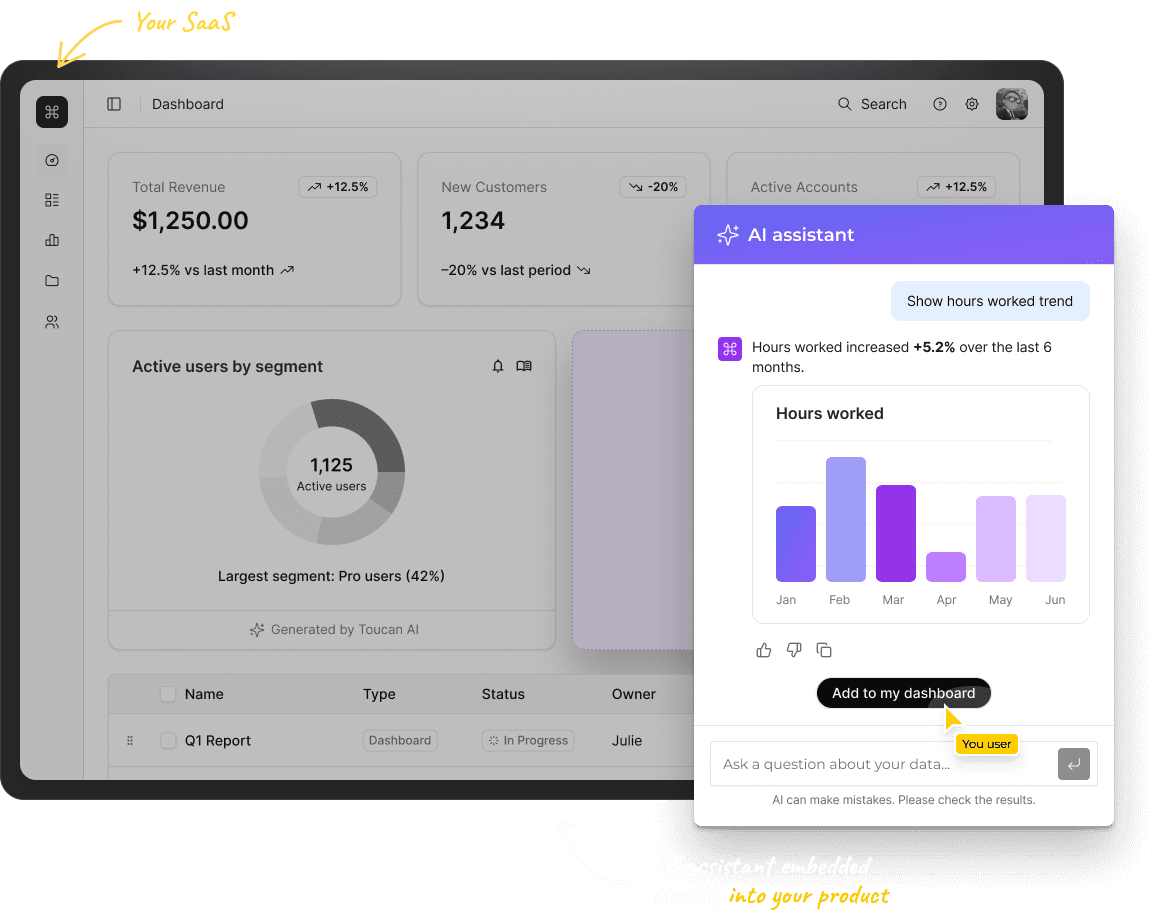 Toucan AI lets product teams embed conversational analytics into their SaaS. Users can ask questions in natural language and instantly get charts with insights.