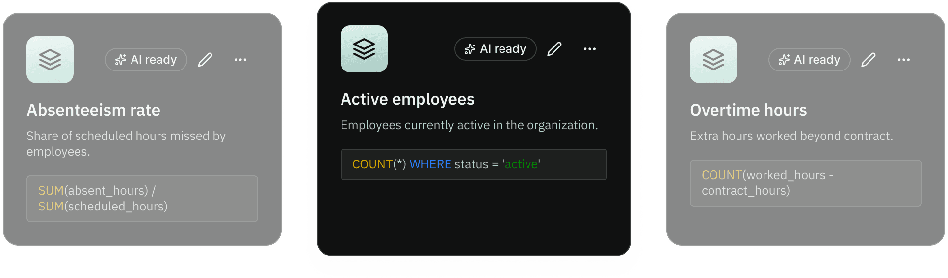 Define metrics once. AI queries accurately. Users understand how results are calculated.